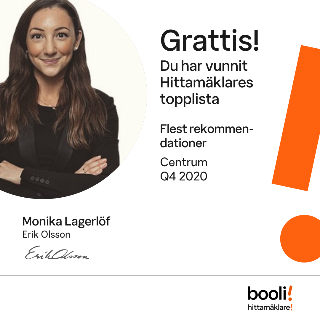Statistik för publicerade bostäder, försäljningar och omdömen baseras på data från Booli och Hittamäklare. Statistiken för försäljningar avser inrapporterade och verifierade slutpriser från mäklare eller av Booli inhämtade och verifierade slutpriser. Statistiken för publicerade bostäder baseras på information som publicerats på Booli.se. Statistik för omdömen och rekommendationer baseras på omdömen från säljare som lämnats via Booli och Hittamäklare.