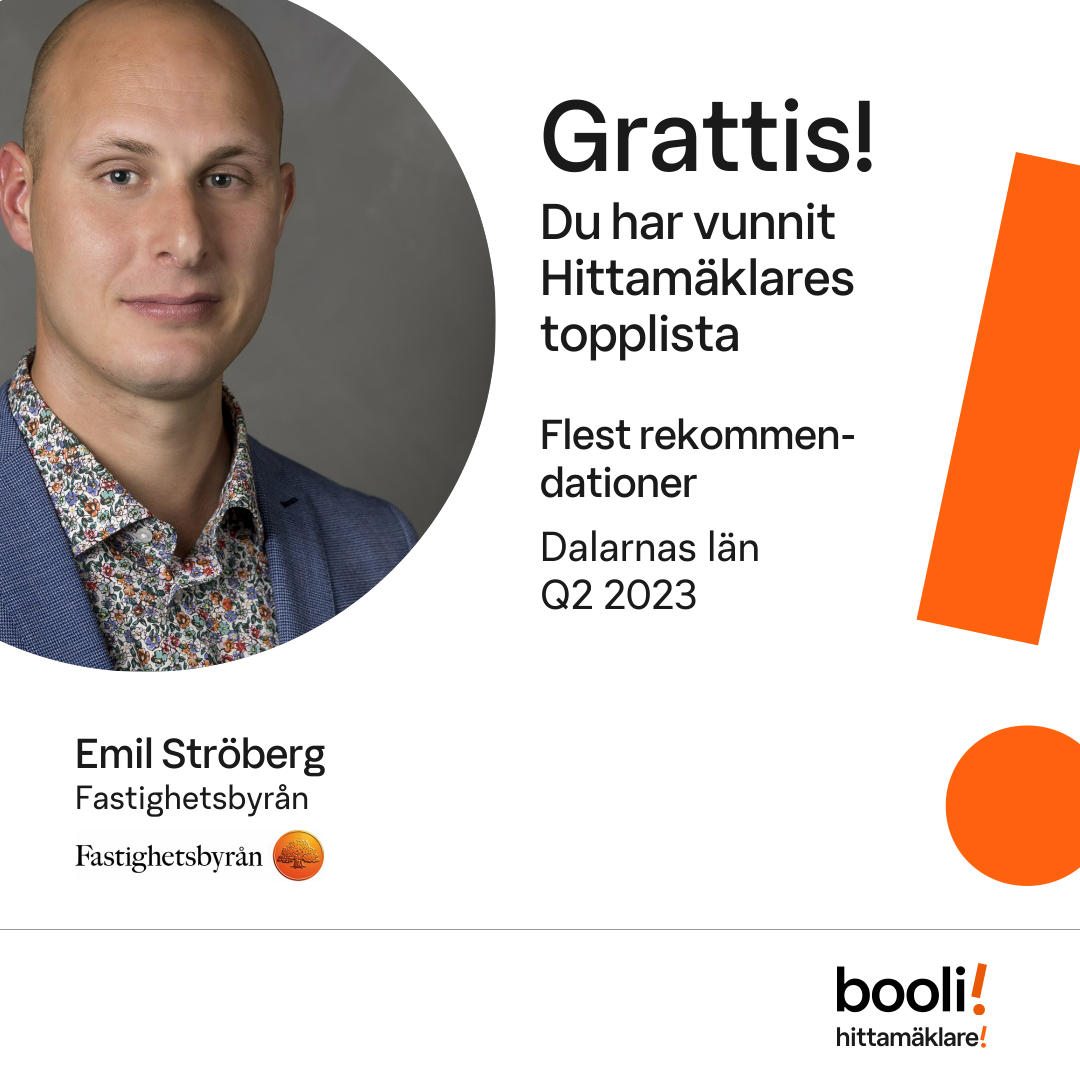 Statistik för publicerade bostäder, försäljningar och omdömen baseras på data från Booli och Hittamäklare. Statistiken för försäljningar avser inrapporterade och verifierade slutpriser från mäklare eller av Booli inhämtade och verifierade slutpriser. Statistiken för publicerade bostäder baseras på information som publicerats på Booli.se. Statistik för omdömen och rekommendationer baseras på omdömen från säljare som lämnats via Booli och Hittamäklare.