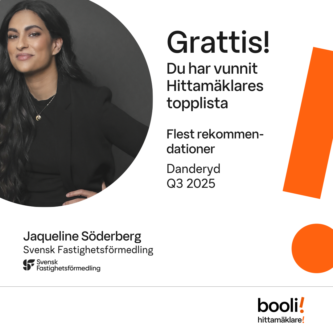 Statistik för publicerade bostäder, försäljningar och omdömen baseras på data från Booli och Hittamäklare. Statistiken för försäljningar avser inrapporterade och verifierade slutpriser från mäklare eller av Booli inhämtade och verifierade slutpriser. Statistiken för publicerade bostäder baseras på information som publicerats på Booli.se. Statistik för omdömen och rekommendationer baseras på omdömen från säljare som lämnats via Booli och Hittamäklare.
