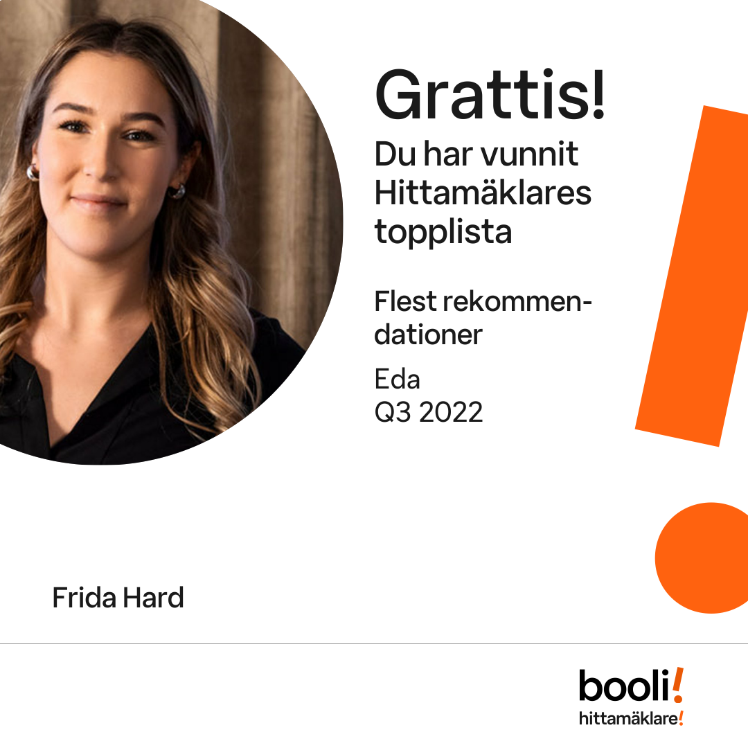 Statistik för publicerade bostäder, försäljningar och omdömen baseras på data från Booli och Hittamäklare. Statistiken för försäljningar avser inrapporterade och verifierade slutpriser från mäklare eller av Booli inhämtade och verifierade slutpriser. Statistiken för publicerade bostäder baseras på information som publicerats på Booli.se. Statistik för omdömen och rekommendationer baseras på omdömen från säljare som lämnats via Booli och Hittamäklare.