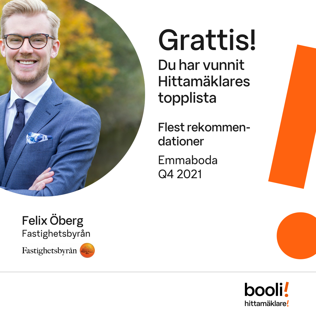 Statistik för publicerade bostäder, försäljningar och omdömen baseras på data från Booli och Hittamäklare. Statistiken för försäljningar avser inrapporterade och verifierade slutpriser från mäklare eller av Booli inhämtade och verifierade slutpriser. Statistiken för publicerade bostäder baseras på information som publicerats på Booli.se. Statistik för omdömen och rekommendationer baseras på omdömen från säljare som lämnats via Booli och Hittamäklare.