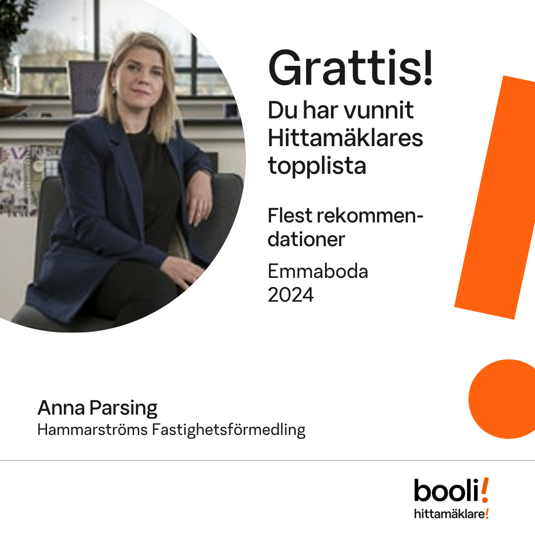 Statistik för publicerade bostäder, försäljningar och omdömen baseras på data från Booli och Hittamäklare. Statistiken för försäljningar avser inrapporterade och verifierade slutpriser från mäklare eller av Booli inhämtade och verifierade slutpriser. Statistiken för publicerade bostäder baseras på information som publicerats på Booli.se. Statistik för omdömen och rekommendationer baseras på omdömen från säljare som lämnats via Booli och Hittamäklare.