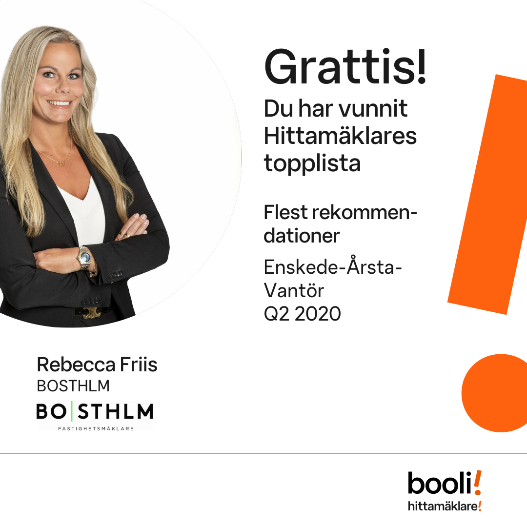 Statistik för publicerade bostäder, försäljningar och omdömen baseras på data från Booli och Hittamäklare. Statistiken för försäljningar avser inrapporterade och verifierade slutpriser från mäklare eller av Booli inhämtade och verifierade slutpriser. Statistiken för publicerade bostäder baseras på information som publicerats på Booli.se. Statistik för omdömen och rekommendationer baseras på omdömen från säljare som lämnats via Booli och Hittamäklare.