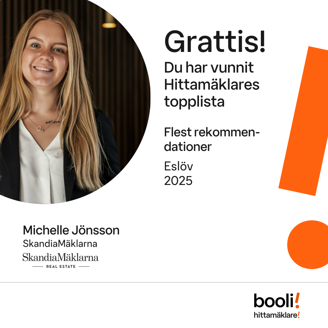 Statistik för publicerade bostäder, försäljningar och omdömen baseras på data från Booli och Hittamäklare. Statistiken för försäljningar avser inrapporterade och verifierade slutpriser från mäklare eller av Booli inhämtade och verifierade slutpriser. Statistiken för publicerade bostäder baseras på information som publicerats på Booli.se. Statistik för omdömen och rekommendationer baseras på omdömen från säljare som lämnats via Booli och Hittamäklare.