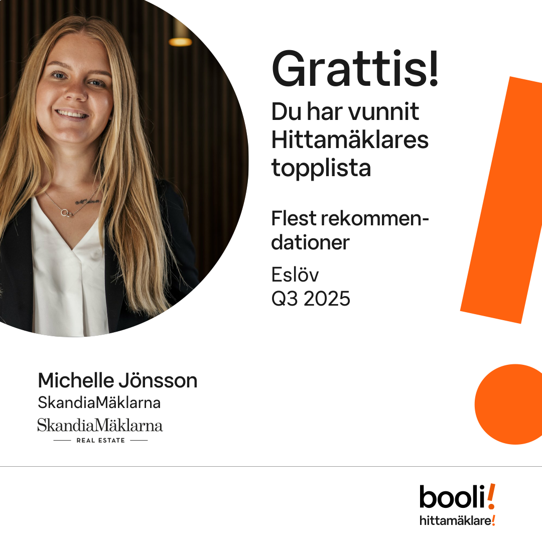 Statistik för publicerade bostäder, försäljningar och omdömen baseras på data från Booli och Hittamäklare. Statistiken för försäljningar avser inrapporterade och verifierade slutpriser från mäklare eller av Booli inhämtade och verifierade slutpriser. Statistiken för publicerade bostäder baseras på information som publicerats på Booli.se. Statistik för omdömen och rekommendationer baseras på omdömen från säljare som lämnats via Booli och Hittamäklare.