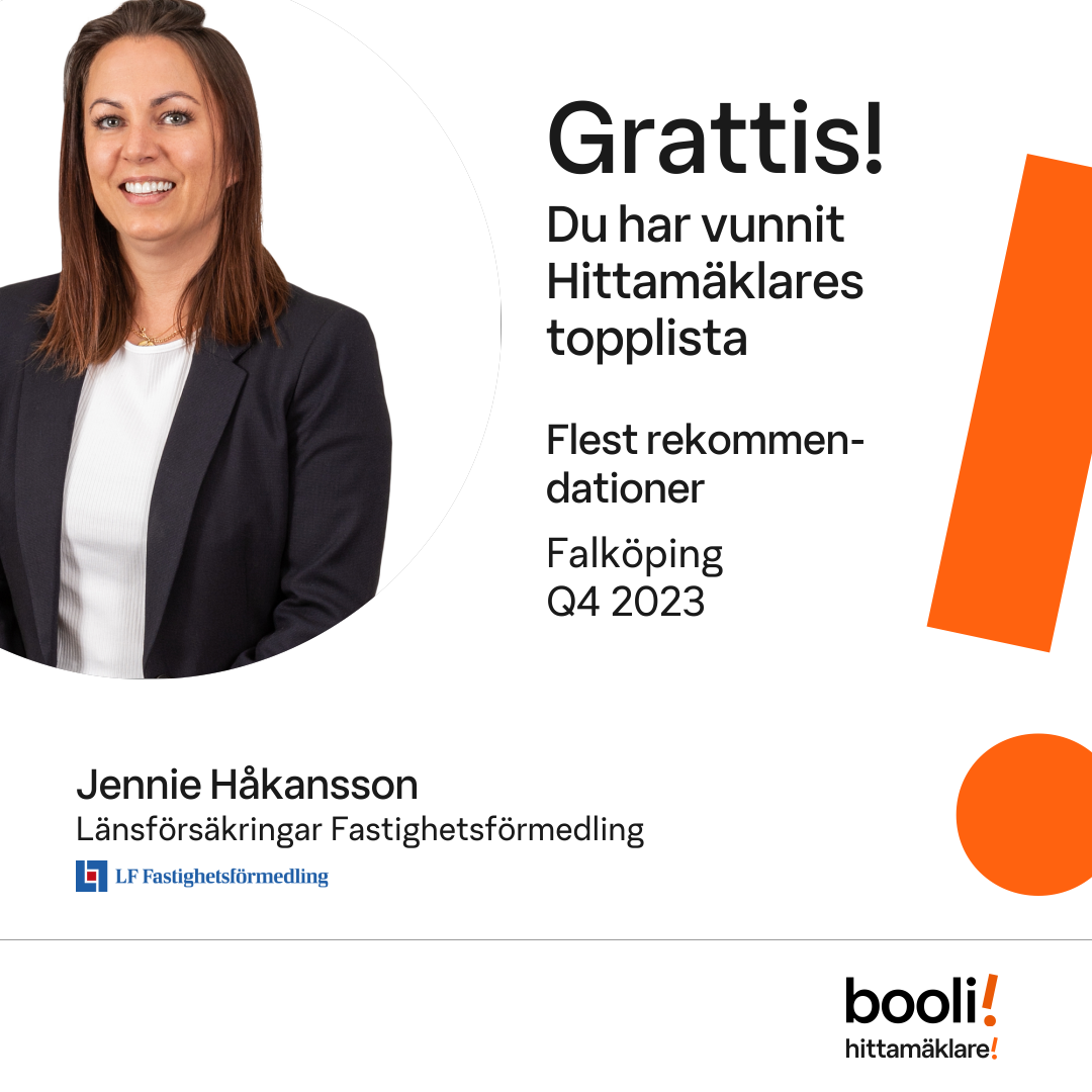 Statistik för publicerade bostäder, försäljningar och omdömen baseras på data från Booli och Hittamäklare. Statistiken för försäljningar avser inrapporterade och verifierade slutpriser från mäklare eller av Booli inhämtade och verifierade slutpriser. Statistiken för publicerade bostäder baseras på information som publicerats på Booli.se. Statistik för omdömen och rekommendationer baseras på omdömen från säljare som lämnats via Booli och Hittamäklare.