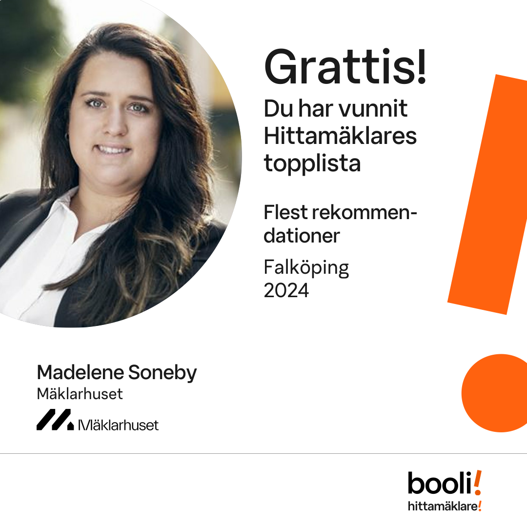 Statistik för publicerade bostäder, försäljningar och omdömen baseras på data från Booli och Hittamäklare. Statistiken för försäljningar avser inrapporterade och verifierade slutpriser från mäklare eller av Booli inhämtade och verifierade slutpriser. Statistiken för publicerade bostäder baseras på information som publicerats på Booli.se. Statistik för omdömen och rekommendationer baseras på omdömen från säljare som lämnats via Booli och Hittamäklare.