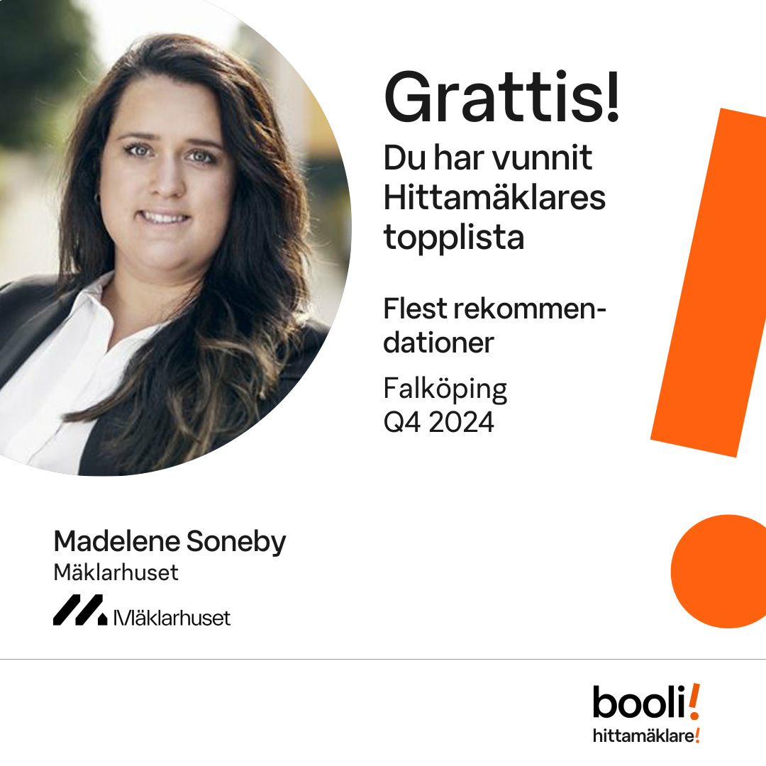 Statistik för publicerade bostäder, försäljningar och omdömen baseras på data från Booli och Hittamäklare. Statistiken för försäljningar avser inrapporterade och verifierade slutpriser från mäklare eller av Booli inhämtade och verifierade slutpriser. Statistiken för publicerade bostäder baseras på information som publicerats på Booli.se. Statistik för omdömen och rekommendationer baseras på omdömen från säljare som lämnats via Booli och Hittamäklare.