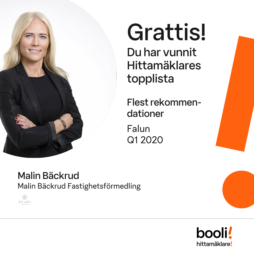 Statistik för publicerade bostäder, försäljningar och omdömen baseras på data från Booli och Hittamäklare. Statistiken för försäljningar avser inrapporterade och verifierade slutpriser från mäklare eller av Booli inhämtade och verifierade slutpriser. Statistiken för publicerade bostäder baseras på information som publicerats på Booli.se. Statistik för omdömen och rekommendationer baseras på omdömen från säljare som lämnats via Booli och Hittamäklare.