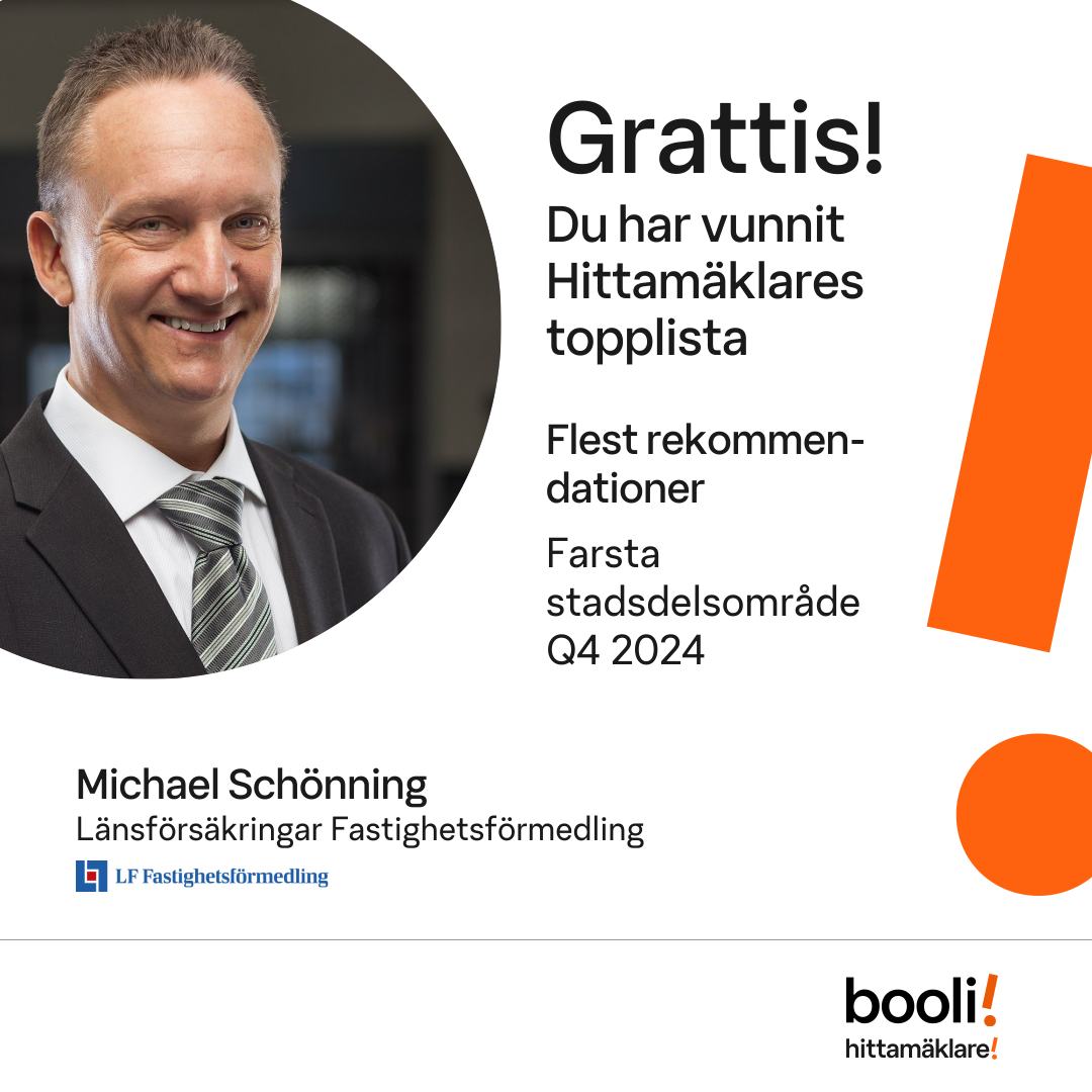 Statistik för publicerade bostäder, försäljningar och omdömen baseras på data från Booli och Hittamäklare. Statistiken för försäljningar avser inrapporterade och verifierade slutpriser från mäklare eller av Booli inhämtade och verifierade slutpriser. Statistiken för publicerade bostäder baseras på information som publicerats på Booli.se. Statistik för omdömen och rekommendationer baseras på omdömen från säljare som lämnats via Booli och Hittamäklare.