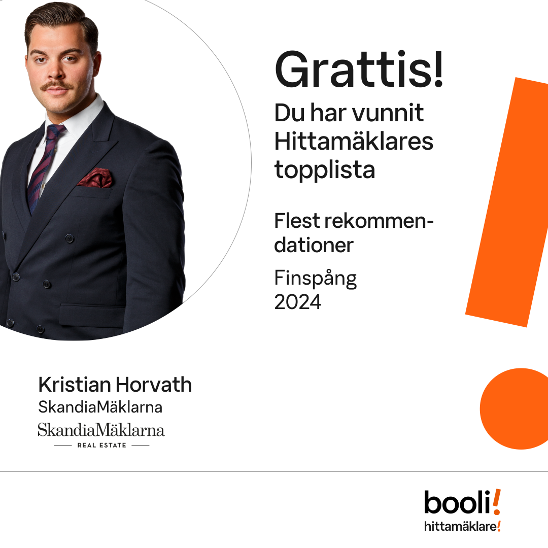 Statistik för publicerade bostäder, försäljningar och omdömen baseras på data från Booli och Hittamäklare. Statistiken för försäljningar avser inrapporterade och verifierade slutpriser från mäklare eller av Booli inhämtade och verifierade slutpriser. Statistiken för publicerade bostäder baseras på information som publicerats på Booli.se. Statistik för omdömen och rekommendationer baseras på omdömen från säljare som lämnats via Booli och Hittamäklare.