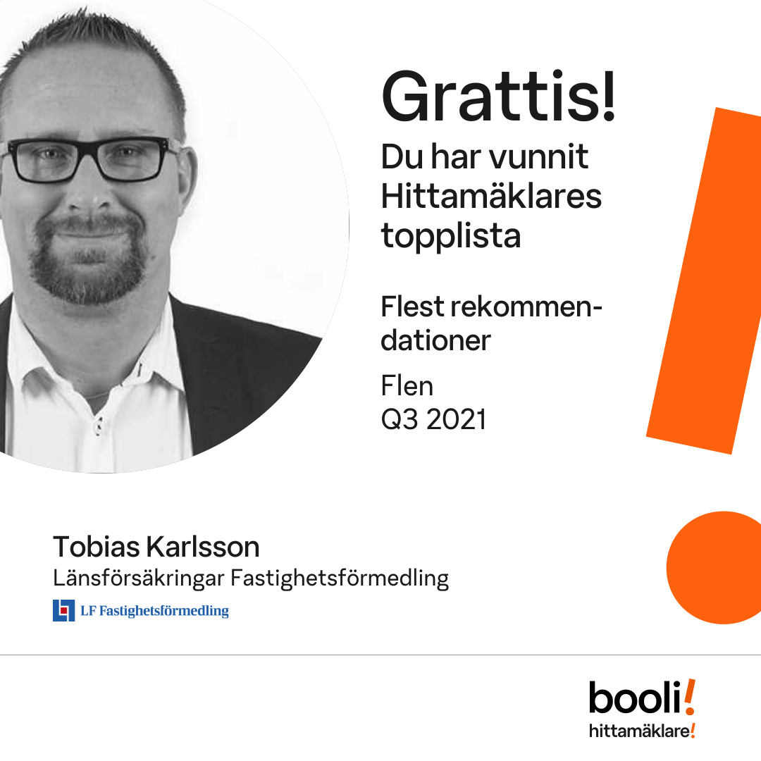 Statistik för publicerade bostäder, försäljningar och omdömen baseras på data från Booli och Hittamäklare. Statistiken för försäljningar avser inrapporterade och verifierade slutpriser från mäklare eller av Booli inhämtade och verifierade slutpriser. Statistiken för publicerade bostäder baseras på information som publicerats på Booli.se. Statistik för omdömen och rekommendationer baseras på omdömen från säljare som lämnats via Booli och Hittamäklare.