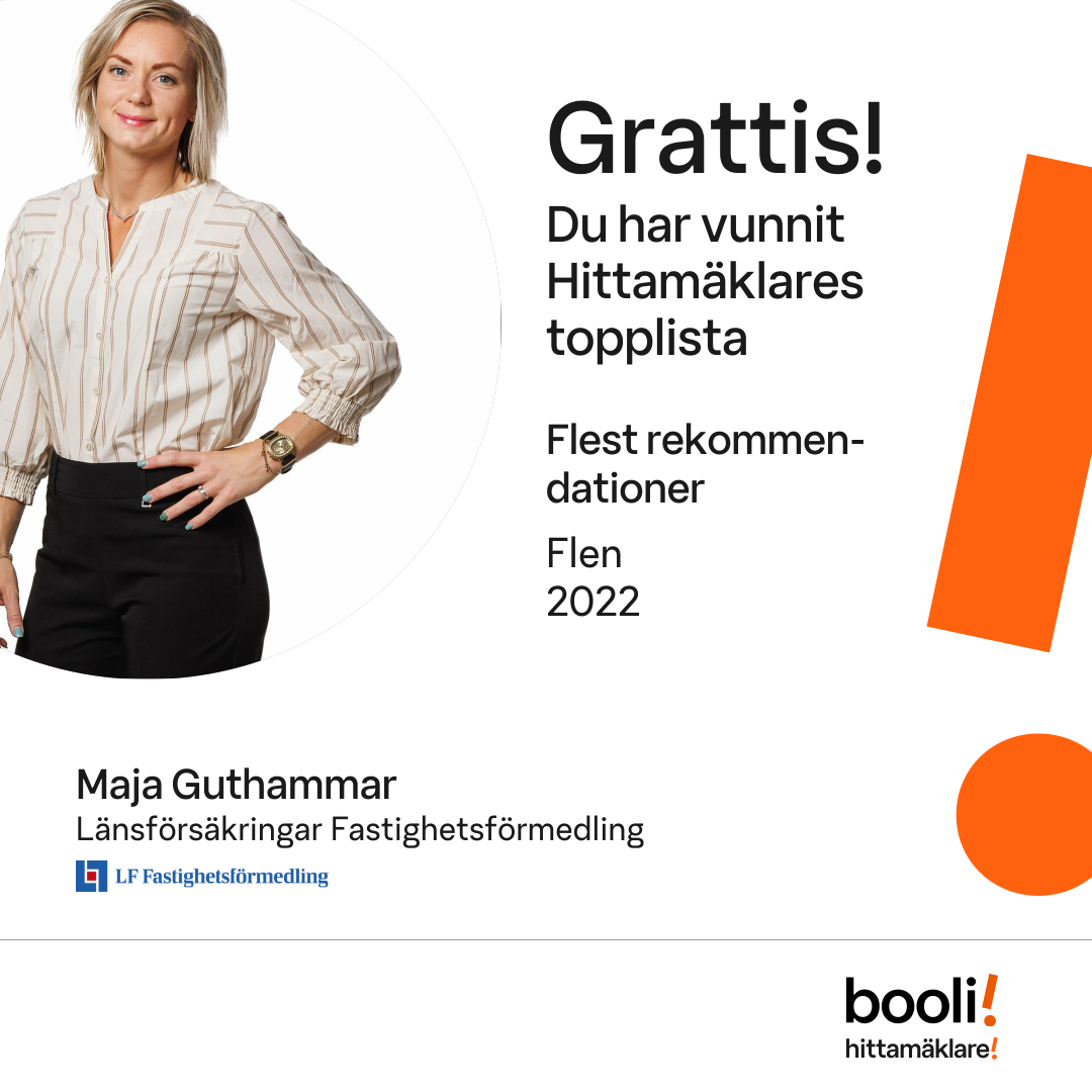Statistik för publicerade bostäder, försäljningar och omdömen baseras på data från Booli och Hittamäklare. Statistiken för försäljningar avser inrapporterade och verifierade slutpriser från mäklare eller av Booli inhämtade och verifierade slutpriser. Statistiken för publicerade bostäder baseras på information som publicerats på Booli.se. Statistik för omdömen och rekommendationer baseras på omdömen från säljare som lämnats via Booli och Hittamäklare.