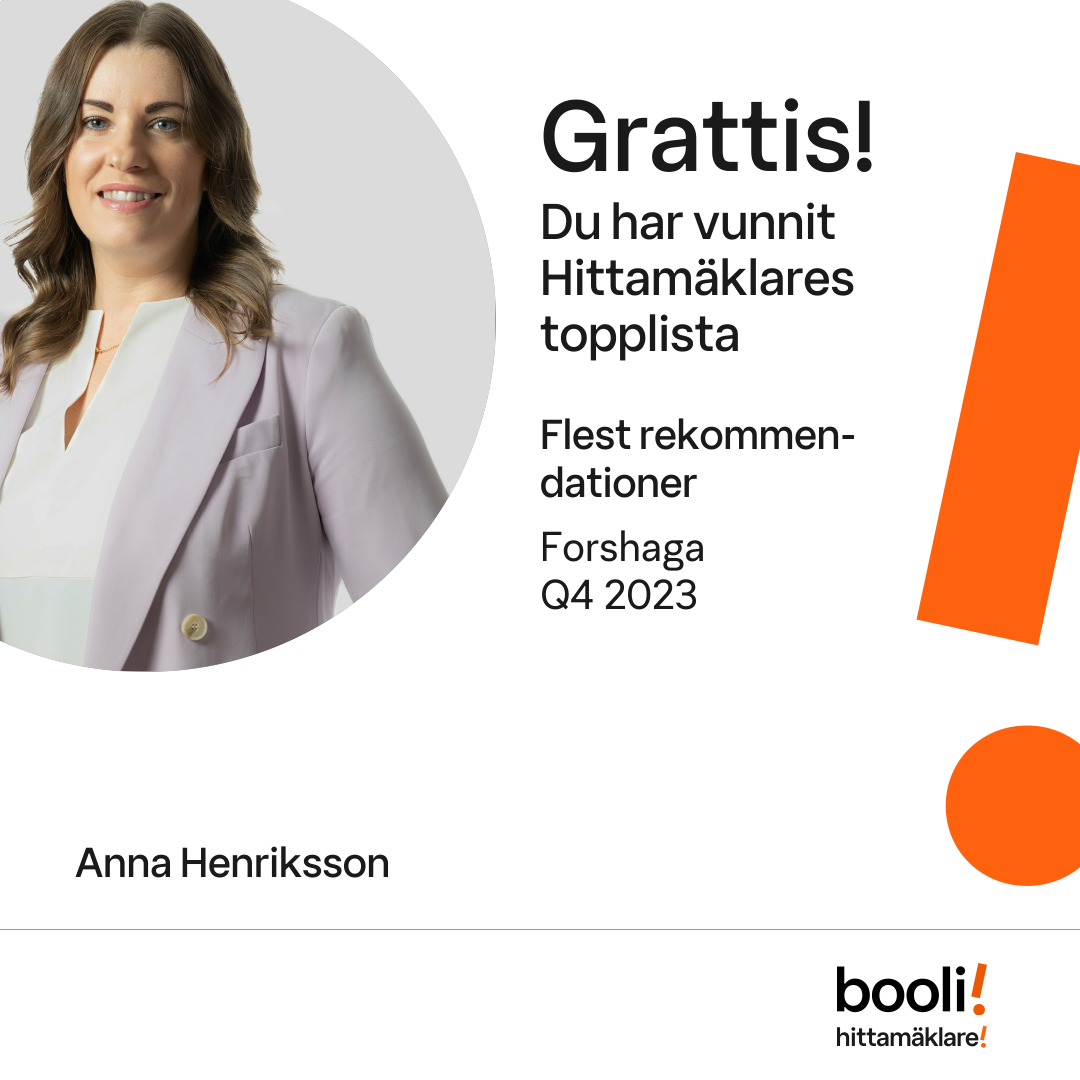 Statistik för publicerade bostäder, försäljningar och omdömen baseras på data från Booli och Hittamäklare. Statistiken för försäljningar avser inrapporterade och verifierade slutpriser från mäklare eller av Booli inhämtade och verifierade slutpriser. Statistiken för publicerade bostäder baseras på information som publicerats på Booli.se. Statistik för omdömen och rekommendationer baseras på omdömen från säljare som lämnats via Booli och Hittamäklare.