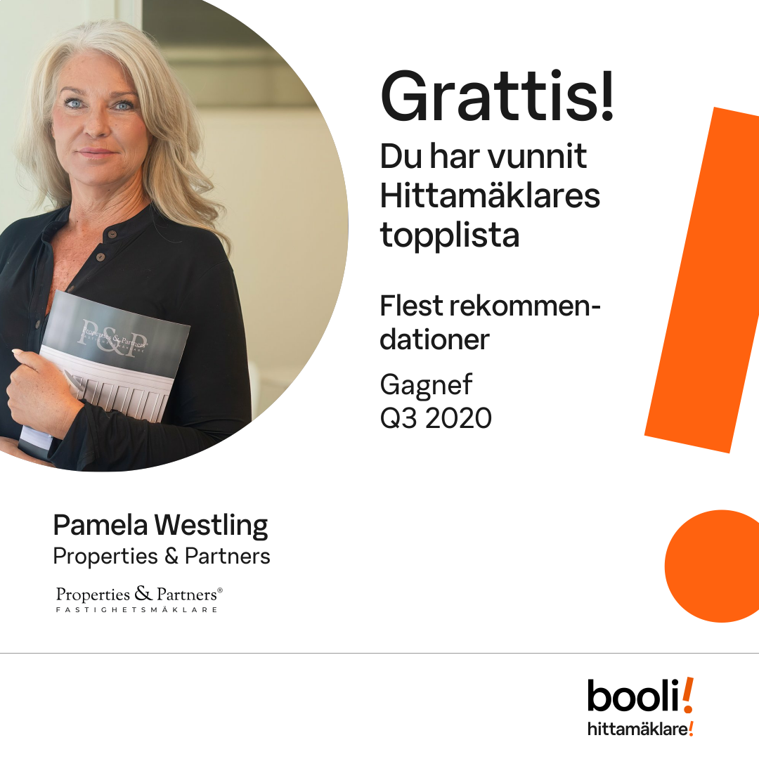 Statistik för publicerade bostäder, försäljningar och omdömen baseras på data från Booli och Hittamäklare. Statistiken för försäljningar avser inrapporterade och verifierade slutpriser från mäklare eller av Booli inhämtade och verifierade slutpriser. Statistiken för publicerade bostäder baseras på information som publicerats på Booli.se. Statistik för omdömen och rekommendationer baseras på omdömen från säljare som lämnats via Booli och Hittamäklare.