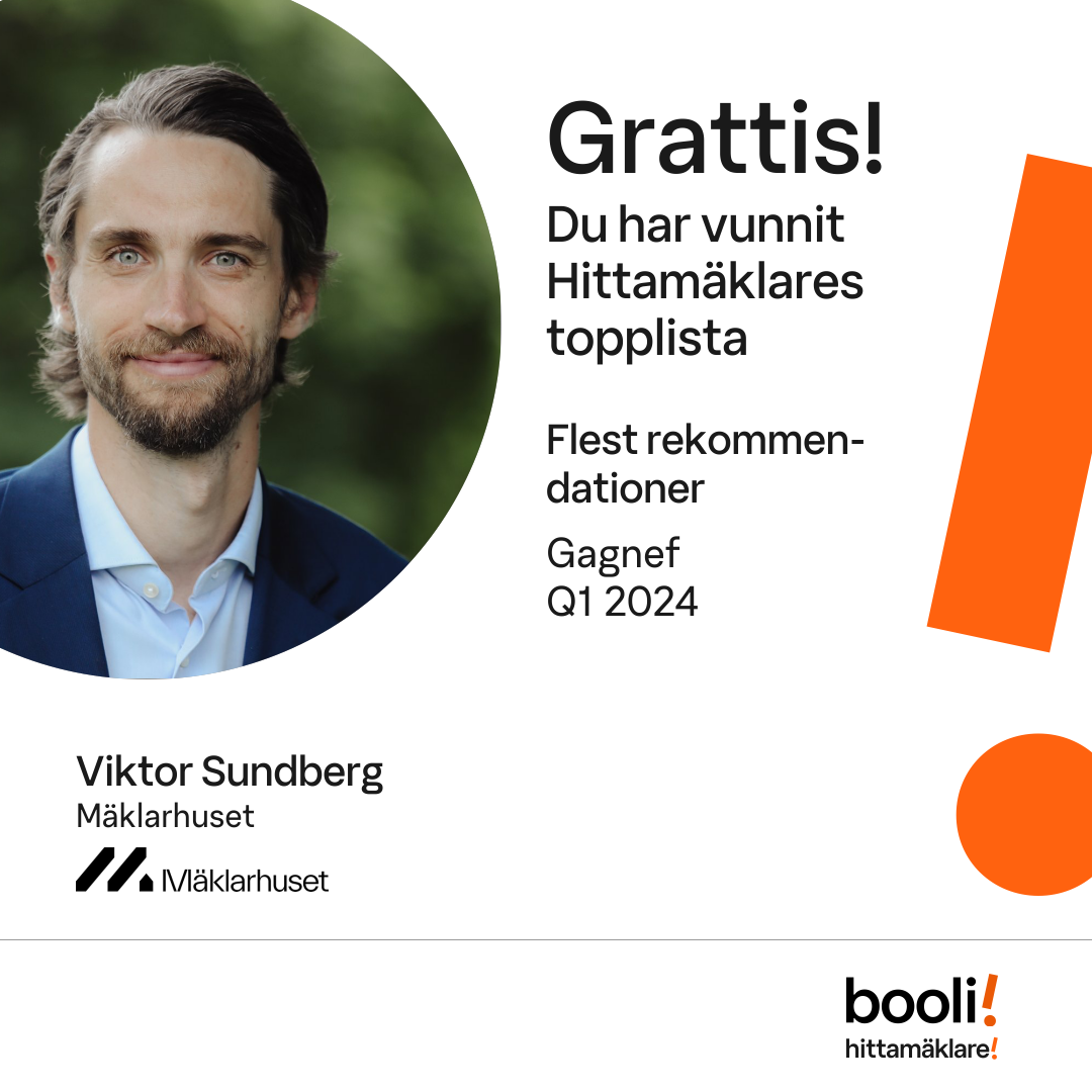 Statistik för publicerade bostäder, försäljningar och omdömen baseras på data från Booli och Hittamäklare. Statistiken för försäljningar avser inrapporterade och verifierade slutpriser från mäklare eller av Booli inhämtade och verifierade slutpriser. Statistiken för publicerade bostäder baseras på information som publicerats på Booli.se. Statistik för omdömen och rekommendationer baseras på omdömen från säljare som lämnats via Booli och Hittamäklare.