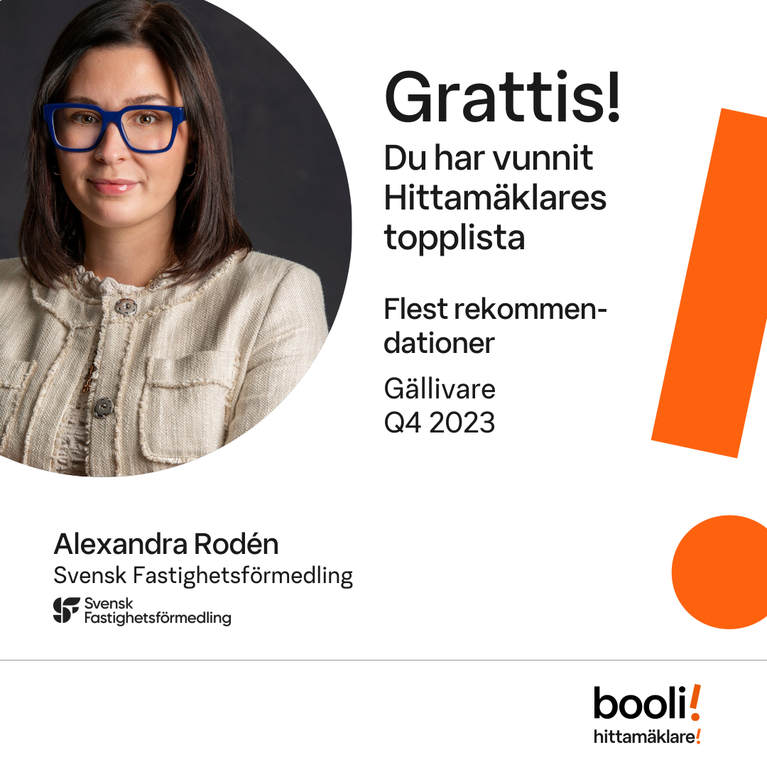 Statistik för publicerade bostäder, försäljningar och omdömen baseras på data från Booli och Hittamäklare. Statistiken för försäljningar avser inrapporterade och verifierade slutpriser från mäklare eller av Booli inhämtade och verifierade slutpriser. Statistiken för publicerade bostäder baseras på information som publicerats på Booli.se. Statistik för omdömen och rekommendationer baseras på omdömen från säljare som lämnats via Booli och Hittamäklare.