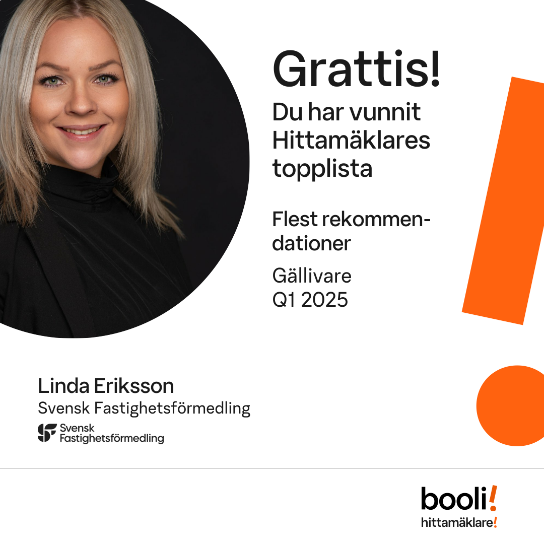 Statistik för publicerade bostäder, försäljningar och omdömen baseras på data från Booli och Hittamäklare. Statistiken för försäljningar avser inrapporterade och verifierade slutpriser från mäklare eller av Booli inhämtade och verifierade slutpriser. Statistiken för publicerade bostäder baseras på information som publicerats på Booli.se. Statistik för omdömen och rekommendationer baseras på omdömen från säljare som lämnats via Booli och Hittamäklare.