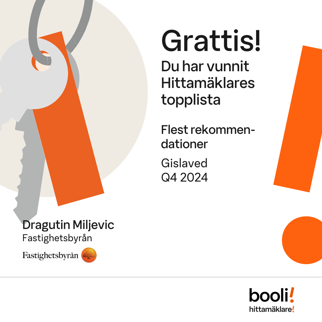 Statistik för publicerade bostäder, försäljningar och omdömen baseras på data från Booli och Hittamäklare. Statistiken för försäljningar avser inrapporterade och verifierade slutpriser från mäklare eller av Booli inhämtade och verifierade slutpriser. Statistiken för publicerade bostäder baseras på information som publicerats på Booli.se. Statistik för omdömen och rekommendationer baseras på omdömen från säljare som lämnats via Booli och Hittamäklare.