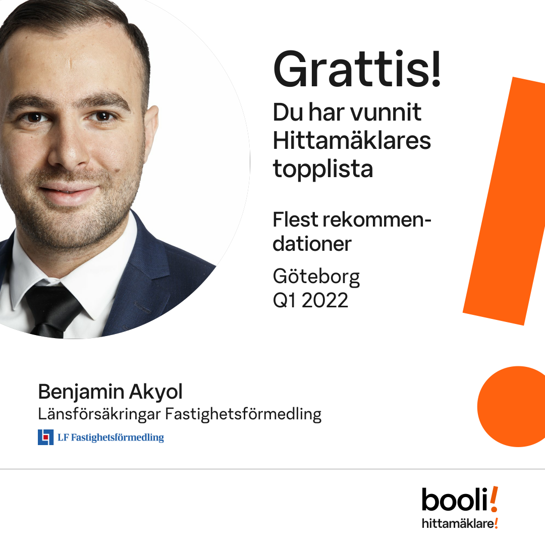 Statistik för publicerade bostäder, försäljningar och omdömen baseras på data från Booli och Hittamäklare. Statistiken för försäljningar avser inrapporterade och verifierade slutpriser från mäklare eller av Booli inhämtade och verifierade slutpriser. Statistiken för publicerade bostäder baseras på information som publicerats på Booli.se. Statistik för omdömen och rekommendationer baseras på omdömen från säljare som lämnats via Booli och Hittamäklare.