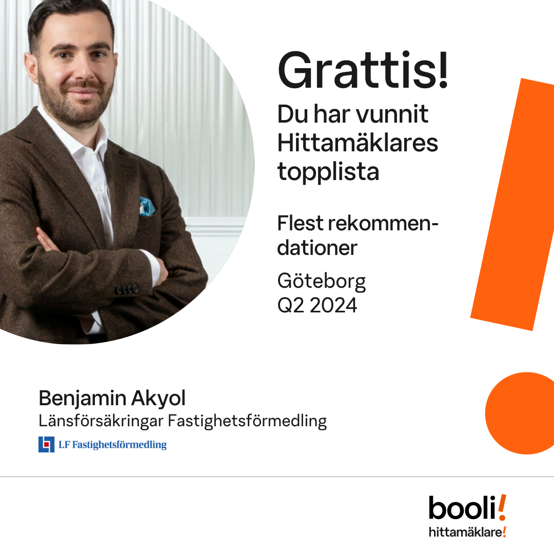 Statistik för publicerade bostäder, försäljningar och omdömen baseras på data från Booli och Hittamäklare. Statistiken för försäljningar avser inrapporterade och verifierade slutpriser från mäklare eller av Booli inhämtade och verifierade slutpriser. Statistiken för publicerade bostäder baseras på information som publicerats på Booli.se. Statistik för omdömen och rekommendationer baseras på omdömen från säljare som lämnats via Booli och Hittamäklare.