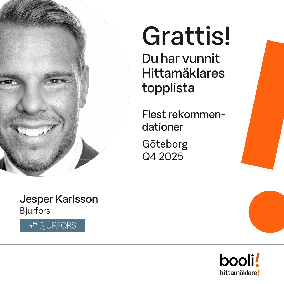 Statistik för publicerade bostäder, försäljningar och omdömen baseras på data från Booli och Hittamäklare. Statistiken för försäljningar avser inrapporterade och verifierade slutpriser från mäklare eller av Booli inhämtade och verifierade slutpriser. Statistiken för publicerade bostäder baseras på information som publicerats på Booli.se. Statistik för omdömen och rekommendationer baseras på omdömen från säljare som lämnats via Booli och Hittamäklare.