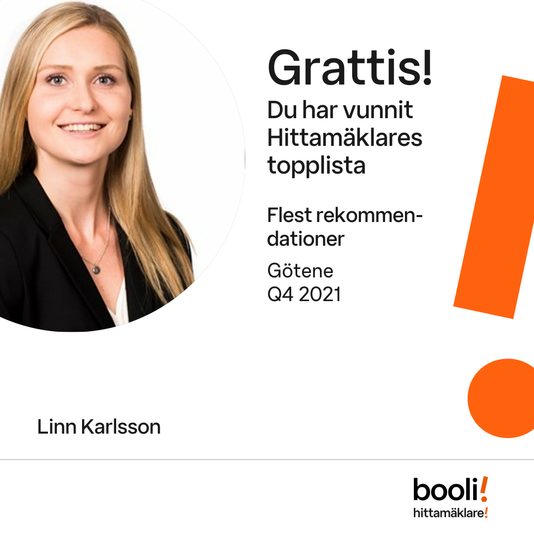 Statistik för publicerade bostäder, försäljningar och omdömen baseras på data från Booli och Hittamäklare. Statistiken för försäljningar avser inrapporterade och verifierade slutpriser från mäklare eller av Booli inhämtade och verifierade slutpriser. Statistiken för publicerade bostäder baseras på information som publicerats på Booli.se. Statistik för omdömen och rekommendationer baseras på omdömen från säljare som lämnats via Booli och Hittamäklare.