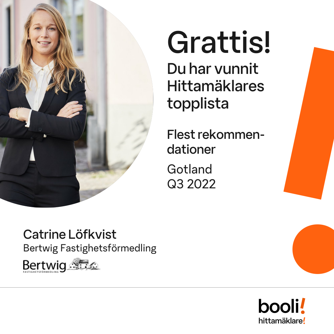 Statistik för publicerade bostäder, försäljningar och omdömen baseras på data från Booli och Hittamäklare. Statistiken för försäljningar avser inrapporterade och verifierade slutpriser från mäklare eller av Booli inhämtade och verifierade slutpriser. Statistiken för publicerade bostäder baseras på information som publicerats på Booli.se. Statistik för omdömen och rekommendationer baseras på omdömen från säljare som lämnats via Booli och Hittamäklare.