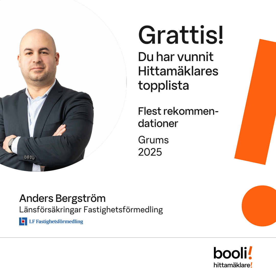 Statistik för publicerade bostäder, försäljningar och omdömen baseras på data från Booli och Hittamäklare. Statistiken för försäljningar avser inrapporterade och verifierade slutpriser från mäklare eller av Booli inhämtade och verifierade slutpriser. Statistiken för publicerade bostäder baseras på information som publicerats på Booli.se. Statistik för omdömen och rekommendationer baseras på omdömen från säljare som lämnats via Booli och Hittamäklare.