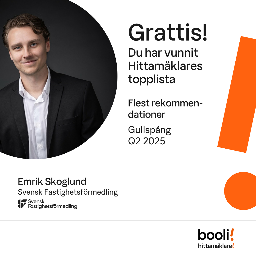 Statistik för publicerade bostäder, försäljningar och omdömen baseras på data från Booli och Hittamäklare. Statistiken för försäljningar avser inrapporterade och verifierade slutpriser från mäklare eller av Booli inhämtade och verifierade slutpriser. Statistiken för publicerade bostäder baseras på information som publicerats på Booli.se. Statistik för omdömen och rekommendationer baseras på omdömen från säljare som lämnats via Booli och Hittamäklare.