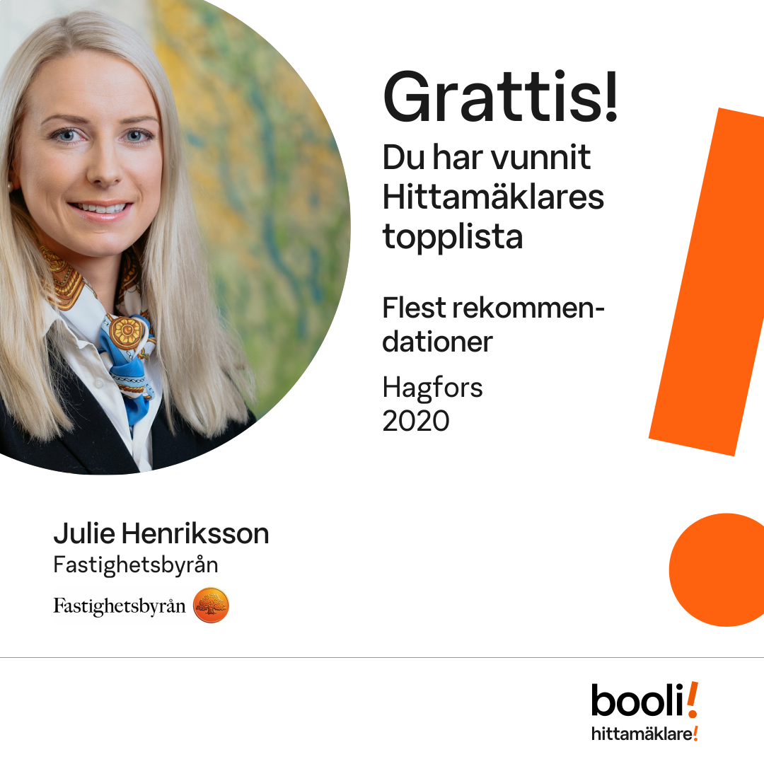 Statistik för publicerade bostäder, försäljningar och omdömen baseras på data från Booli och Hittamäklare. Statistiken för försäljningar avser inrapporterade och verifierade slutpriser från mäklare eller av Booli inhämtade och verifierade slutpriser. Statistiken för publicerade bostäder baseras på information som publicerats på Booli.se. Statistik för omdömen och rekommendationer baseras på omdömen från säljare som lämnats via Booli och Hittamäklare.