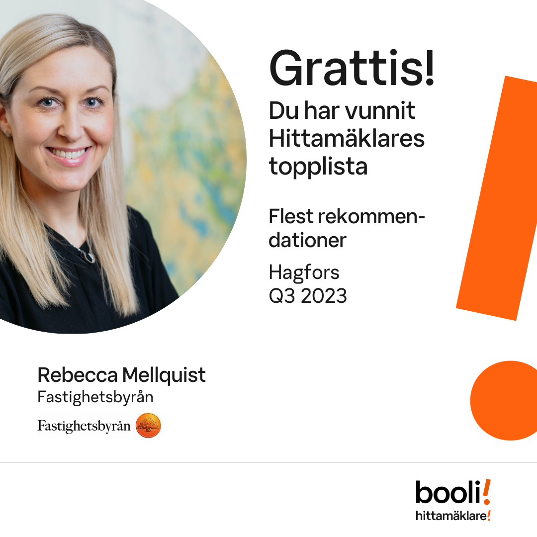 Statistik för publicerade bostäder, försäljningar och omdömen baseras på data från Booli och Hittamäklare. Statistiken för försäljningar avser inrapporterade och verifierade slutpriser från mäklare eller av Booli inhämtade och verifierade slutpriser. Statistiken för publicerade bostäder baseras på information som publicerats på Booli.se. Statistik för omdömen och rekommendationer baseras på omdömen från säljare som lämnats via Booli och Hittamäklare.