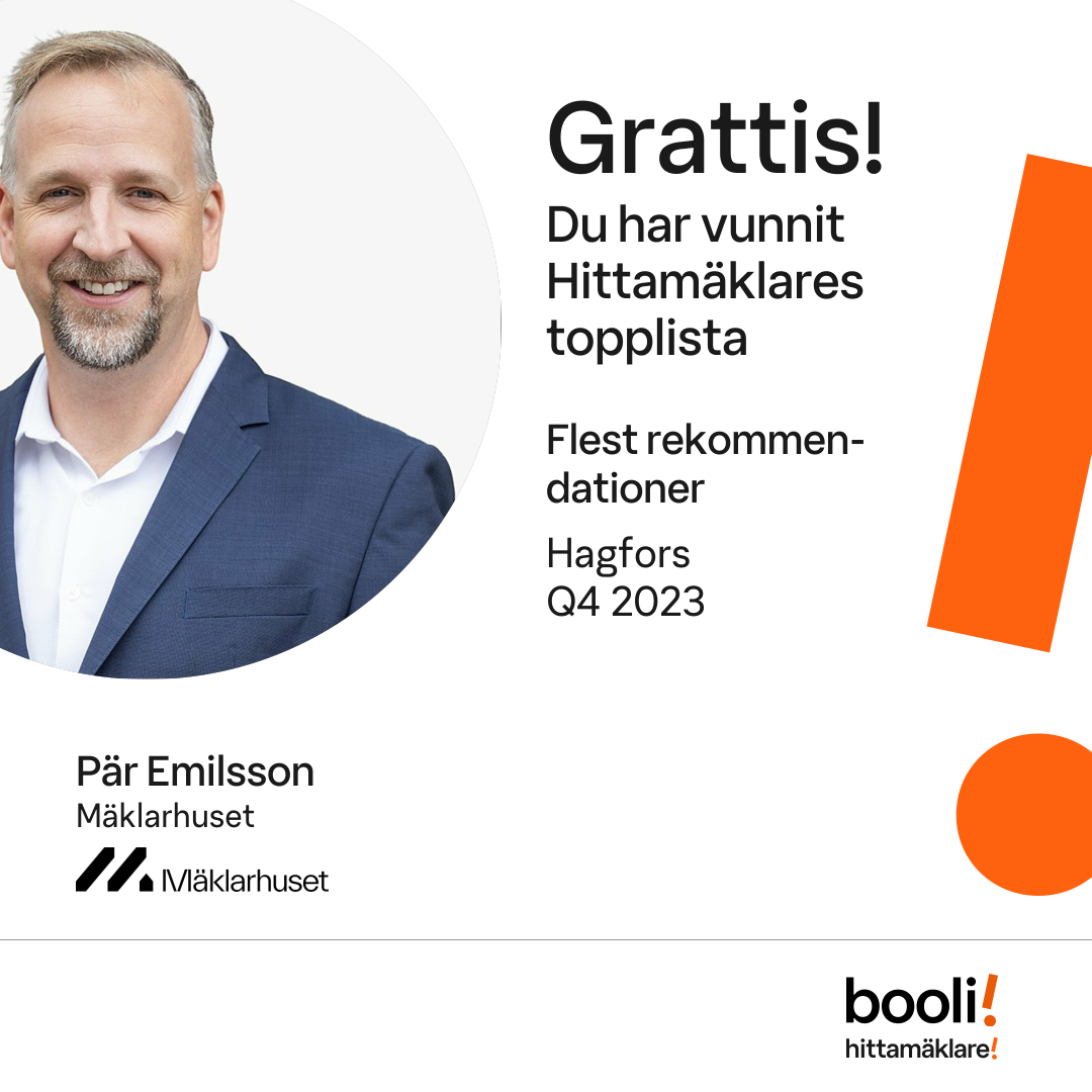 Statistik för publicerade bostäder, försäljningar och omdömen baseras på data från Booli och Hittamäklare. Statistiken för försäljningar avser inrapporterade och verifierade slutpriser från mäklare eller av Booli inhämtade och verifierade slutpriser. Statistiken för publicerade bostäder baseras på information som publicerats på Booli.se. Statistik för omdömen och rekommendationer baseras på omdömen från säljare som lämnats via Booli och Hittamäklare.