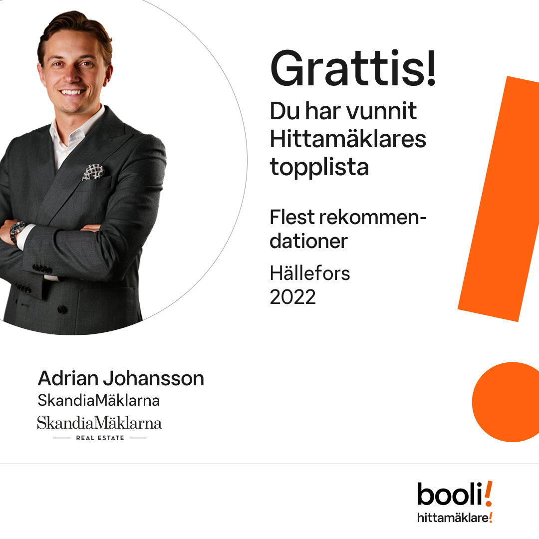 Statistik för publicerade bostäder, försäljningar och omdömen baseras på data från Booli och Hittamäklare. Statistiken för försäljningar avser inrapporterade och verifierade slutpriser från mäklare eller av Booli inhämtade och verifierade slutpriser. Statistiken för publicerade bostäder baseras på information som publicerats på Booli.se. Statistik för omdömen och rekommendationer baseras på omdömen från säljare som lämnats via Booli och Hittamäklare.