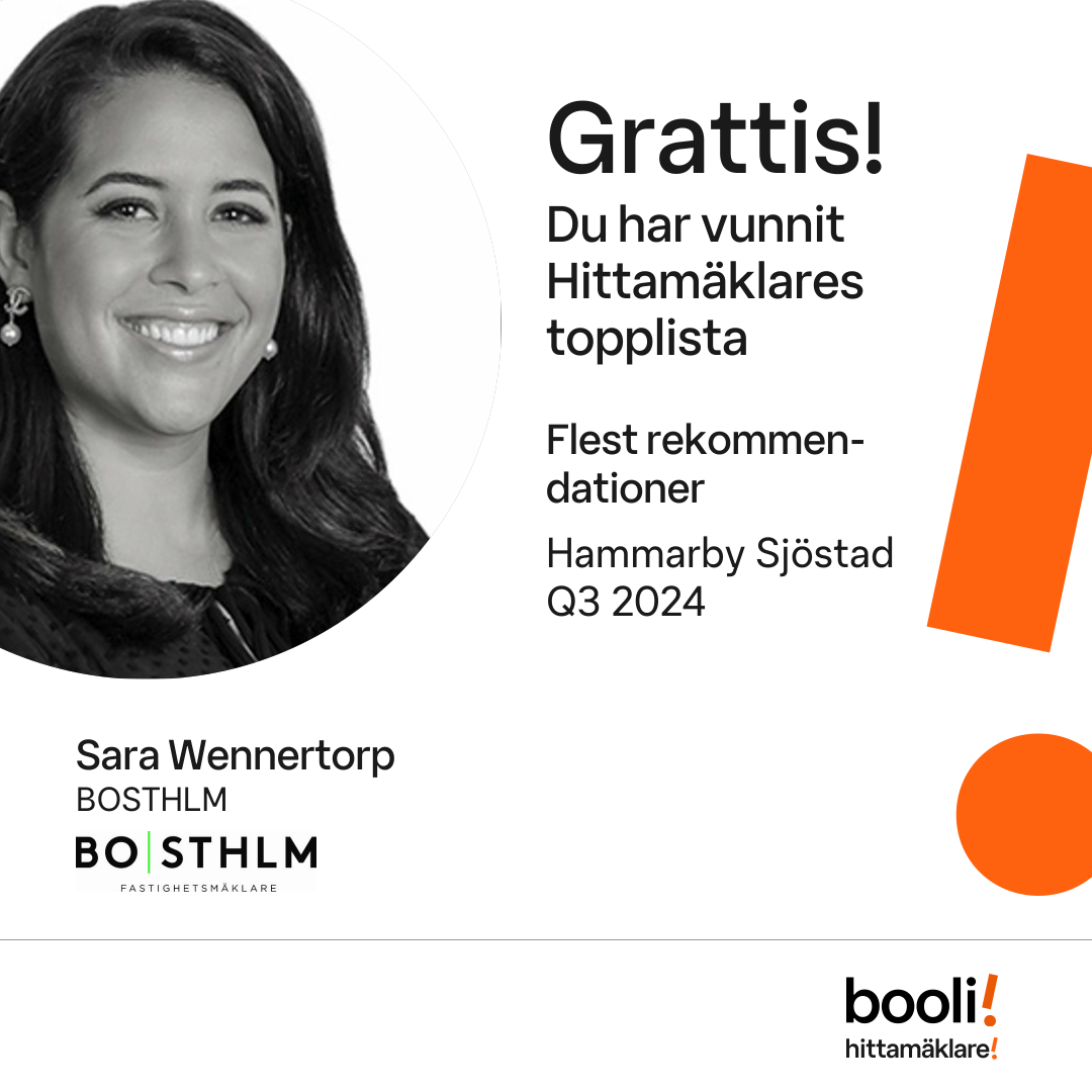Statistik för publicerade bostäder, försäljningar och omdömen baseras på data från Booli och Hittamäklare. Statistiken för försäljningar avser inrapporterade och verifierade slutpriser från mäklare eller av Booli inhämtade och verifierade slutpriser. Statistiken för publicerade bostäder baseras på information som publicerats på Booli.se. Statistik för omdömen och rekommendationer baseras på omdömen från säljare som lämnats via Booli och Hittamäklare.