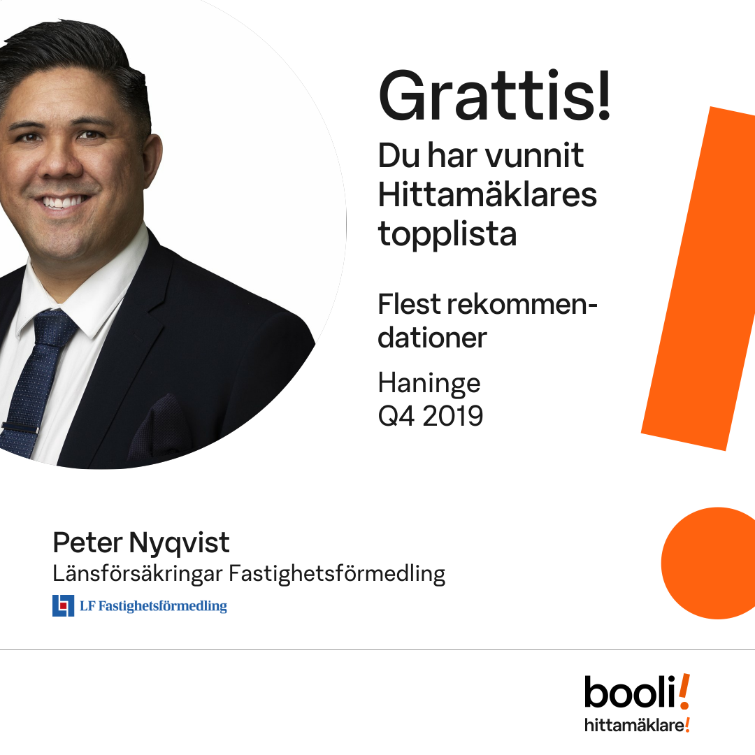 Statistik för publicerade bostäder, försäljningar och omdömen baseras på data från Booli och Hittamäklare. Statistiken för försäljningar avser inrapporterade och verifierade slutpriser från mäklare eller av Booli inhämtade och verifierade slutpriser. Statistiken för publicerade bostäder baseras på information som publicerats på Booli.se. Statistik för omdömen och rekommendationer baseras på omdömen från säljare som lämnats via Booli och Hittamäklare.