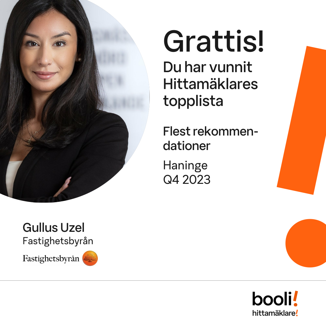 Statistik för publicerade bostäder, försäljningar och omdömen baseras på data från Booli och Hittamäklare. Statistiken för försäljningar avser inrapporterade och verifierade slutpriser från mäklare eller av Booli inhämtade och verifierade slutpriser. Statistiken för publicerade bostäder baseras på information som publicerats på Booli.se. Statistik för omdömen och rekommendationer baseras på omdömen från säljare som lämnats via Booli och Hittamäklare.