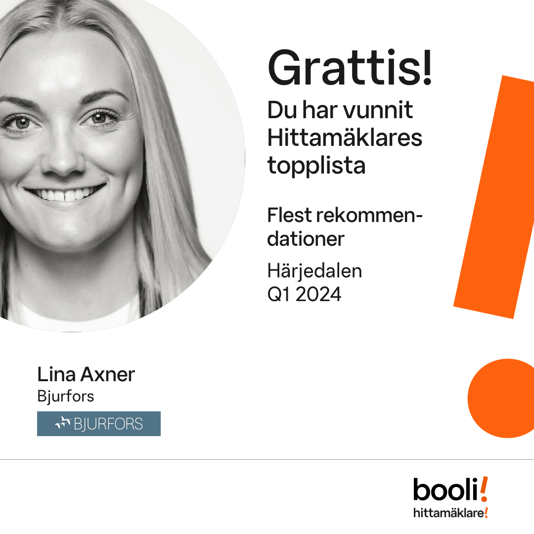 Statistik för publicerade bostäder, försäljningar och omdömen baseras på data från Booli och Hittamäklare. Statistiken för försäljningar avser inrapporterade och verifierade slutpriser från mäklare eller av Booli inhämtade och verifierade slutpriser. Statistiken för publicerade bostäder baseras på information som publicerats på Booli.se. Statistik för omdömen och rekommendationer baseras på omdömen från säljare som lämnats via Booli och Hittamäklare.
