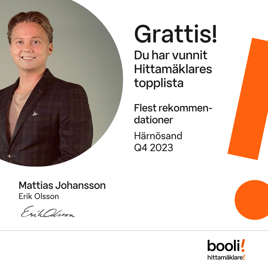 Statistik för publicerade bostäder, försäljningar och omdömen baseras på data från Booli och Hittamäklare. Statistiken för försäljningar avser inrapporterade och verifierade slutpriser från mäklare eller av Booli inhämtade och verifierade slutpriser. Statistiken för publicerade bostäder baseras på information som publicerats på Booli.se. Statistik för omdömen och rekommendationer baseras på omdömen från säljare som lämnats via Booli och Hittamäklare.