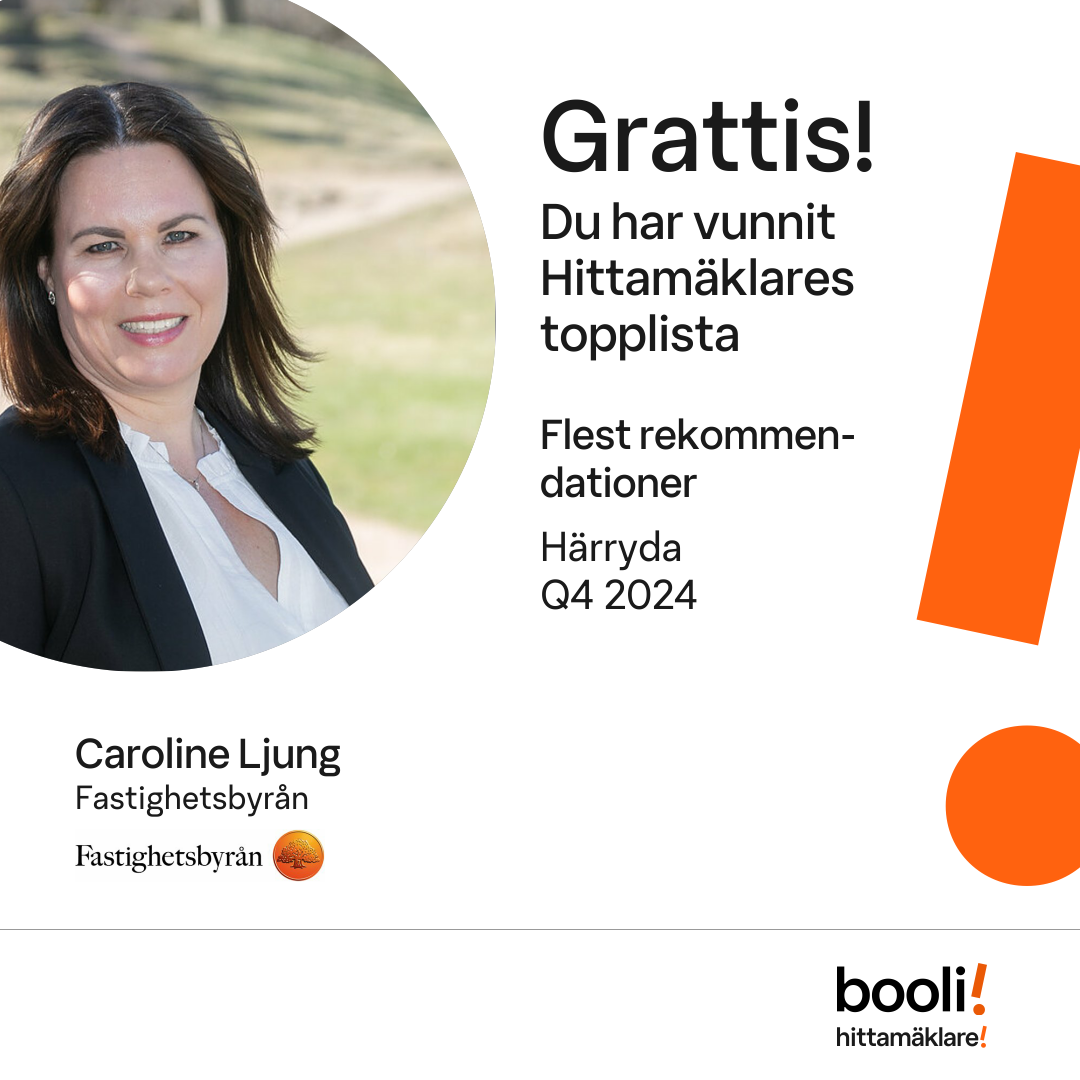 Statistik för publicerade bostäder, försäljningar och omdömen baseras på data från Booli och Hittamäklare. Statistiken för försäljningar avser inrapporterade och verifierade slutpriser från mäklare eller av Booli inhämtade och verifierade slutpriser. Statistiken för publicerade bostäder baseras på information som publicerats på Booli.se. Statistik för omdömen och rekommendationer baseras på omdömen från säljare som lämnats via Booli och Hittamäklare.