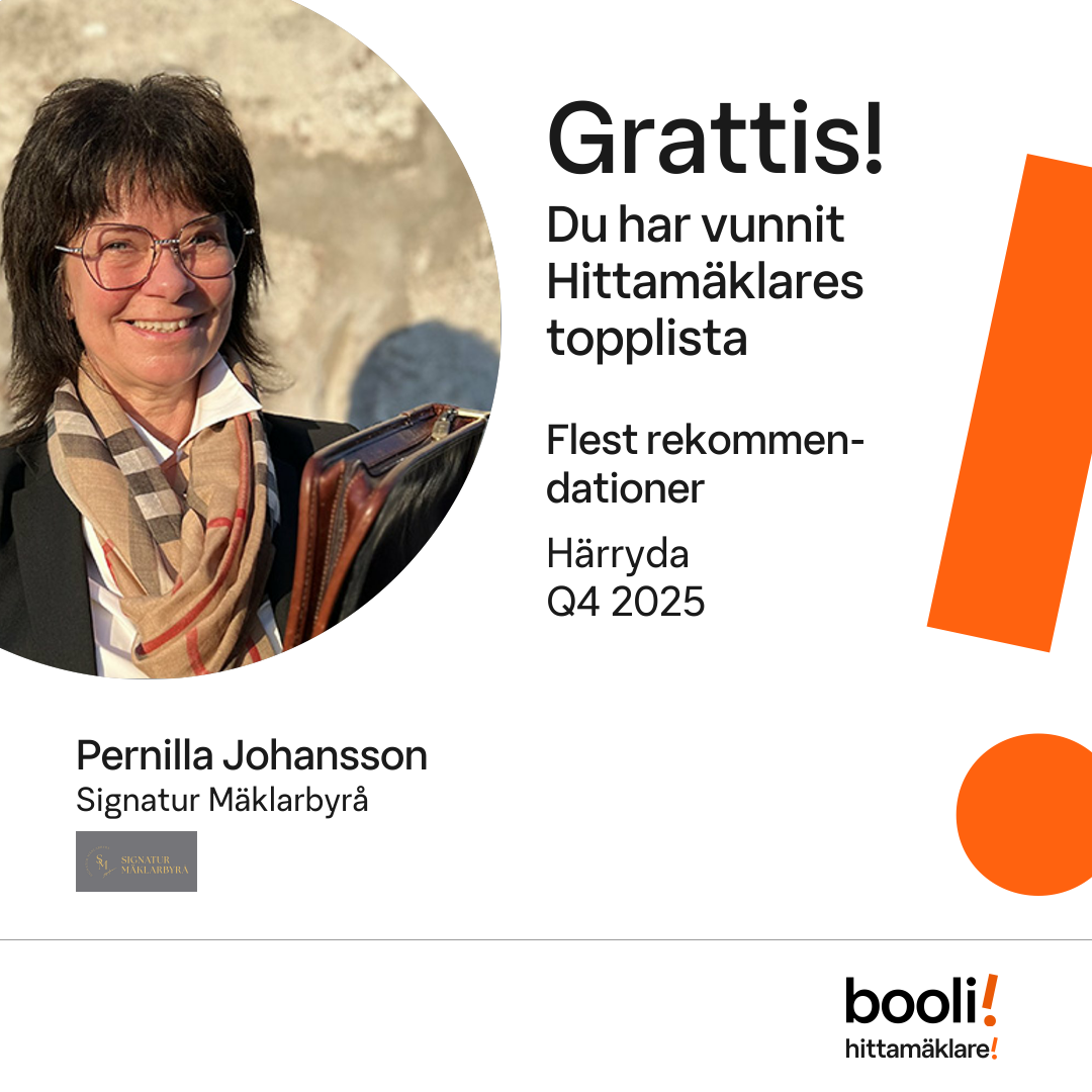 Statistik för publicerade bostäder, försäljningar och omdömen baseras på data från Booli och Hittamäklare. Statistiken för försäljningar avser inrapporterade och verifierade slutpriser från mäklare eller av Booli inhämtade och verifierade slutpriser. Statistiken för publicerade bostäder baseras på information som publicerats på Booli.se. Statistik för omdömen och rekommendationer baseras på omdömen från säljare som lämnats via Booli och Hittamäklare.