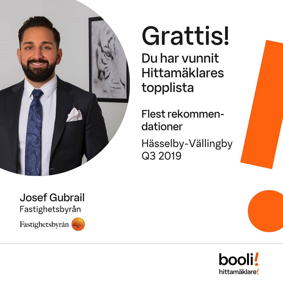 Statistik för publicerade bostäder, försäljningar och omdömen baseras på data från Booli och Hittamäklare. Statistiken för försäljningar avser inrapporterade och verifierade slutpriser från mäklare eller av Booli inhämtade och verifierade slutpriser. Statistiken för publicerade bostäder baseras på information som publicerats på Booli.se. Statistik för omdömen och rekommendationer baseras på omdömen från säljare som lämnats via Booli och Hittamäklare.