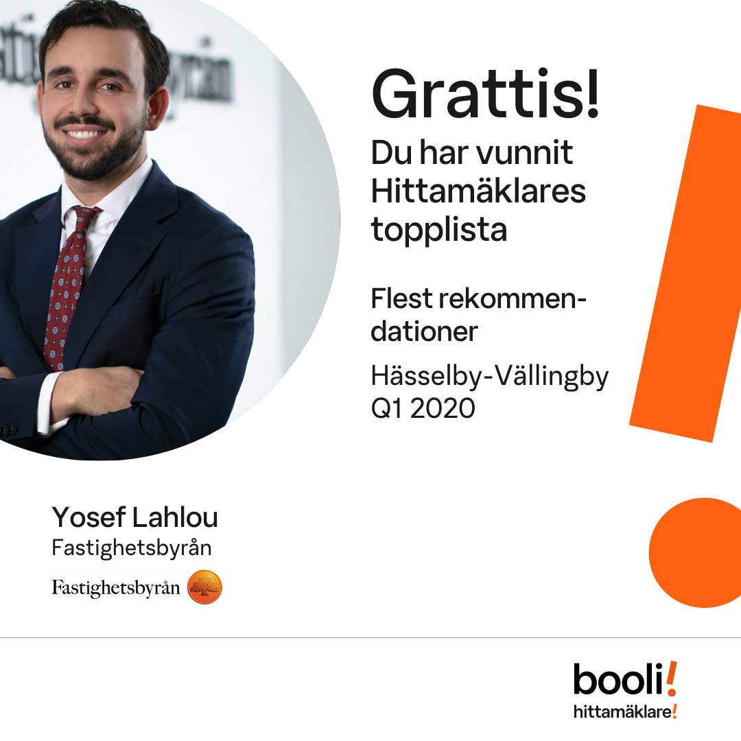 Statistik för publicerade bostäder, försäljningar och omdömen baseras på data från Booli och Hittamäklare. Statistiken för försäljningar avser inrapporterade och verifierade slutpriser från mäklare eller av Booli inhämtade och verifierade slutpriser. Statistiken för publicerade bostäder baseras på information som publicerats på Booli.se. Statistik för omdömen och rekommendationer baseras på omdömen från säljare som lämnats via Booli och Hittamäklare.