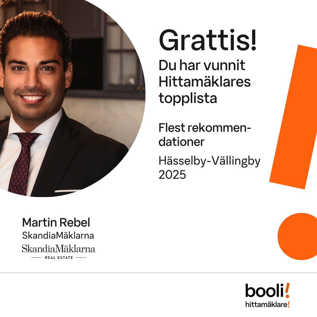 Statistik för publicerade bostäder, försäljningar och omdömen baseras på data från Booli och Hittamäklare. Statistiken för försäljningar avser inrapporterade och verifierade slutpriser från mäklare eller av Booli inhämtade och verifierade slutpriser. Statistiken för publicerade bostäder baseras på information som publicerats på Booli.se. Statistik för omdömen och rekommendationer baseras på omdömen från säljare som lämnats via Booli och Hittamäklare.