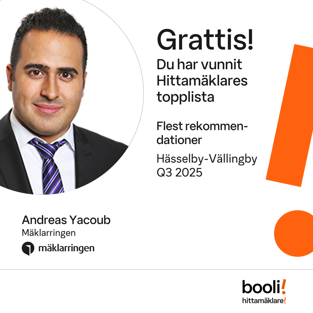 Statistik för publicerade bostäder, försäljningar och omdömen baseras på data från Booli och Hittamäklare. Statistiken för försäljningar avser inrapporterade och verifierade slutpriser från mäklare eller av Booli inhämtade och verifierade slutpriser. Statistiken för publicerade bostäder baseras på information som publicerats på Booli.se. Statistik för omdömen och rekommendationer baseras på omdömen från säljare som lämnats via Booli och Hittamäklare.