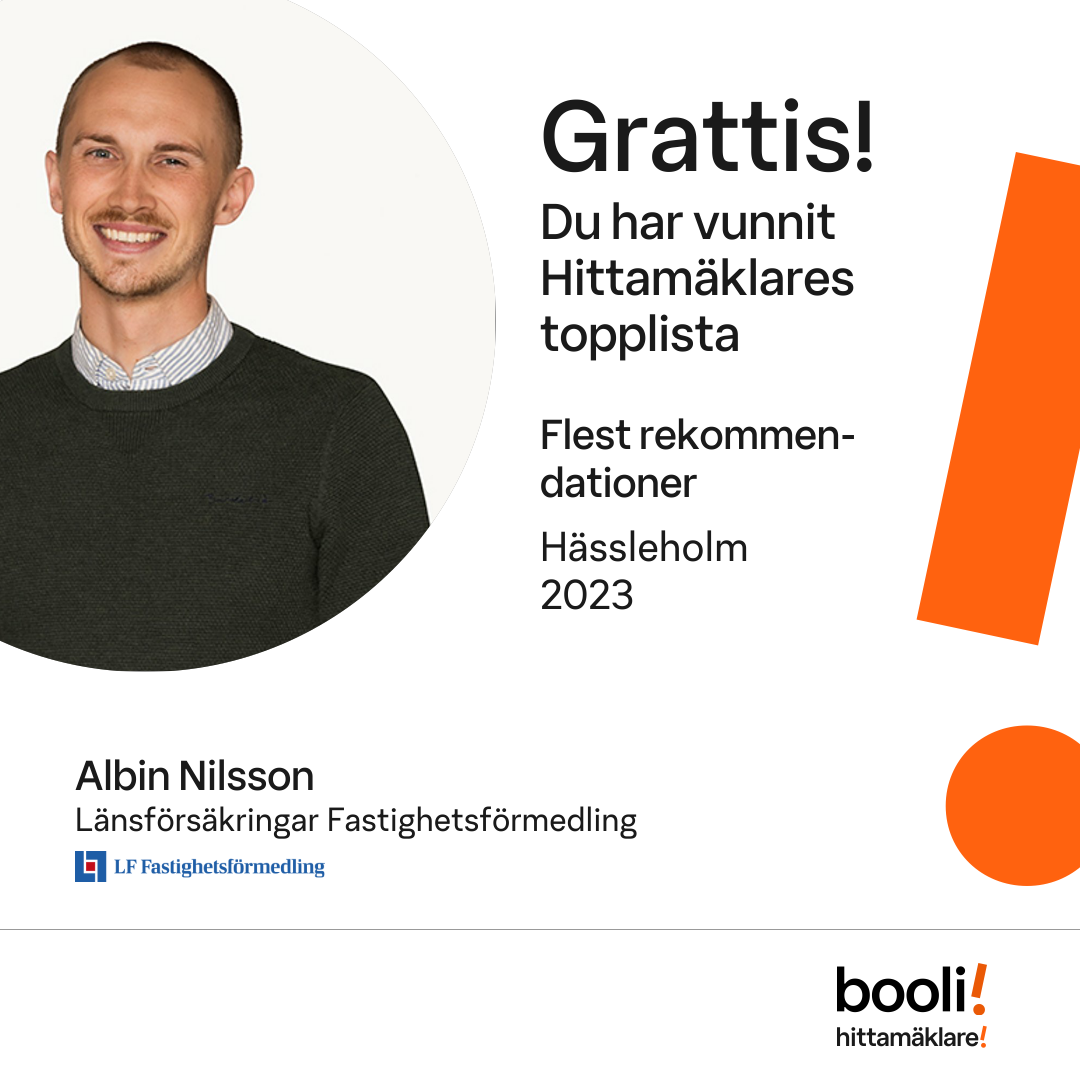 Statistik för publicerade bostäder, försäljningar och omdömen baseras på data från Booli och Hittamäklare. Statistiken för försäljningar avser inrapporterade och verifierade slutpriser från mäklare eller av Booli inhämtade och verifierade slutpriser. Statistiken för publicerade bostäder baseras på information som publicerats på Booli.se. Statistik för omdömen och rekommendationer baseras på omdömen från säljare som lämnats via Booli och Hittamäklare.