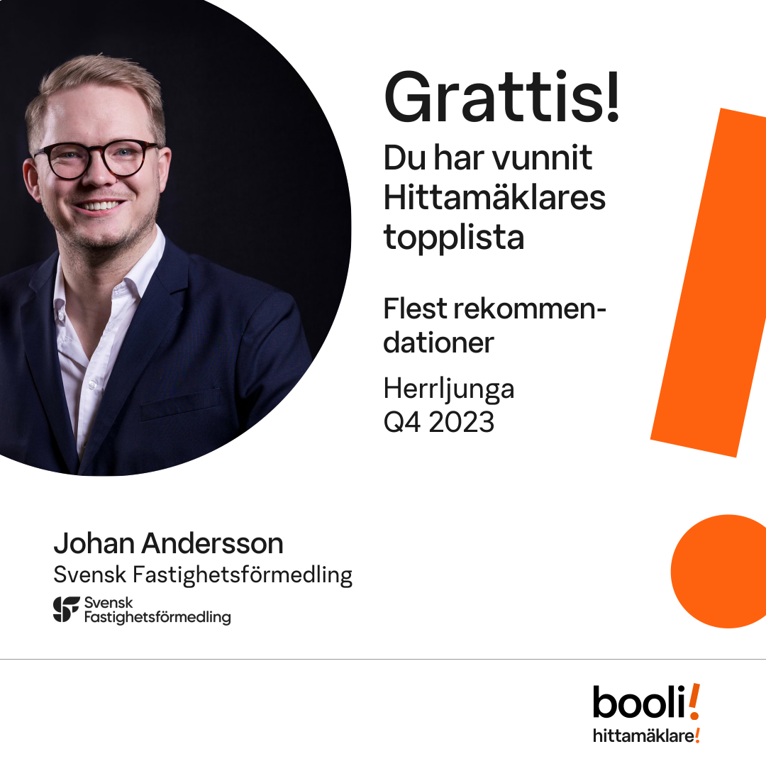 Statistik för publicerade bostäder, försäljningar och omdömen baseras på data från Booli. Statistiken för försäljningar avser inrapporterade och verifierade slutpriser från mäklare eller av Booli inhämtade och verifierade slutpriser. Statistiken för publicerade bostäder baseras på information som publicerats på Booli.se. Statistik för omdömen och rekommendationer baseras på omdömen från säljare som lämnats via Booli.