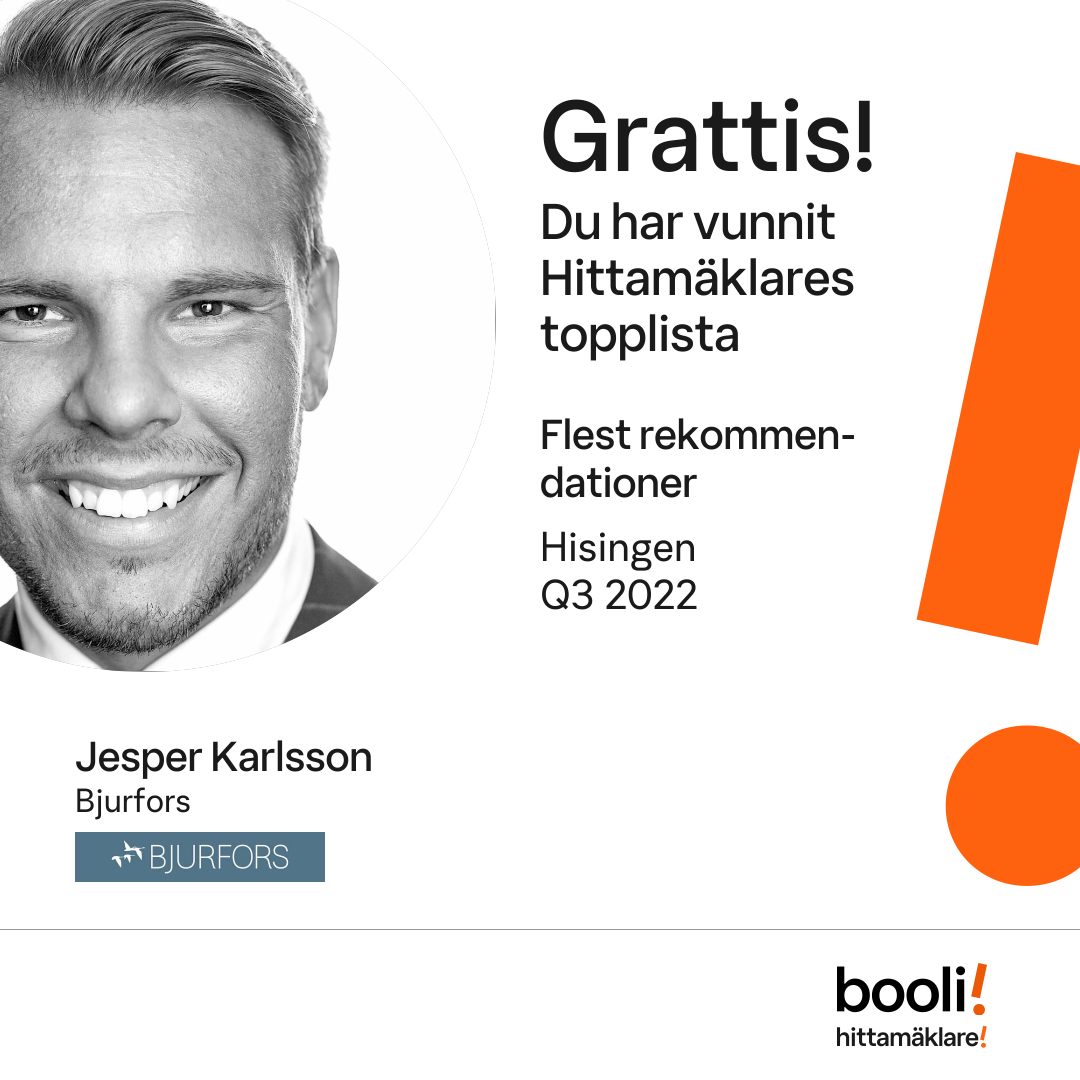 Statistik för publicerade bostäder, försäljningar och omdömen baseras på data från Booli och Hittamäklare. Statistiken för försäljningar avser inrapporterade och verifierade slutpriser från mäklare eller av Booli inhämtade och verifierade slutpriser. Statistiken för publicerade bostäder baseras på information som publicerats på Booli.se. Statistik för omdömen och rekommendationer baseras på omdömen från säljare som lämnats via Booli och Hittamäklare.