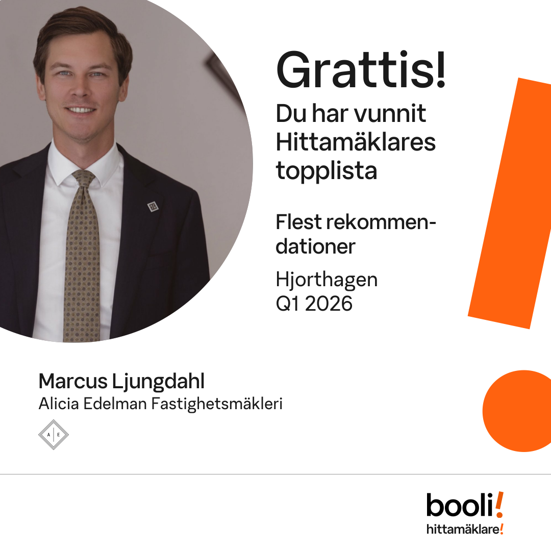 Statistik för publicerade bostäder, försäljningar och omdömen baseras på data från Booli och Hittamäklare. Statistiken för försäljningar avser inrapporterade och verifierade slutpriser från mäklare eller av Booli inhämtade och verifierade slutpriser. Statistiken för publicerade bostäder baseras på information som publicerats på Booli.se. Statistik för omdömen och rekommendationer baseras på omdömen från säljare som lämnats via Booli och Hittamäklare.