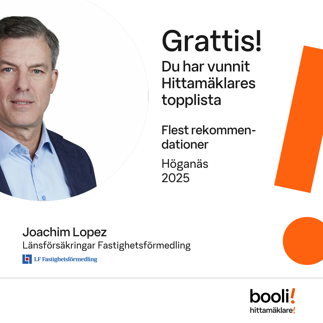 Statistik för publicerade bostäder, försäljningar och omdömen baseras på data från Booli och Hittamäklare. Statistiken för försäljningar avser inrapporterade och verifierade slutpriser från mäklare eller av Booli inhämtade och verifierade slutpriser. Statistiken för publicerade bostäder baseras på information som publicerats på Booli.se. Statistik för omdömen och rekommendationer baseras på omdömen från säljare som lämnats via Booli och Hittamäklare.